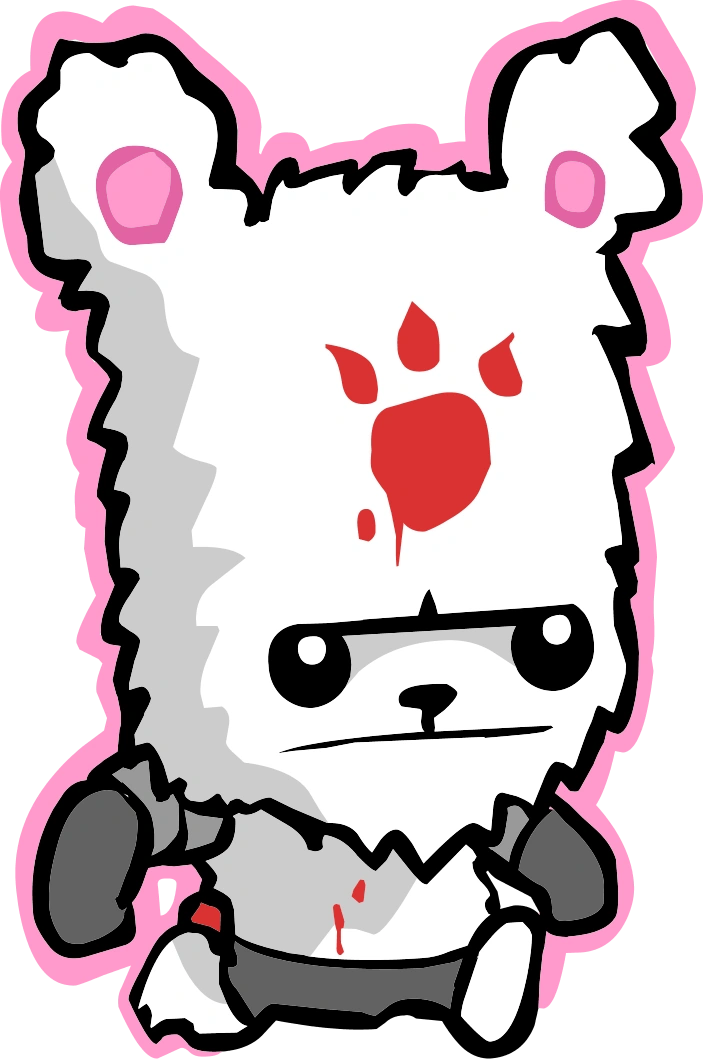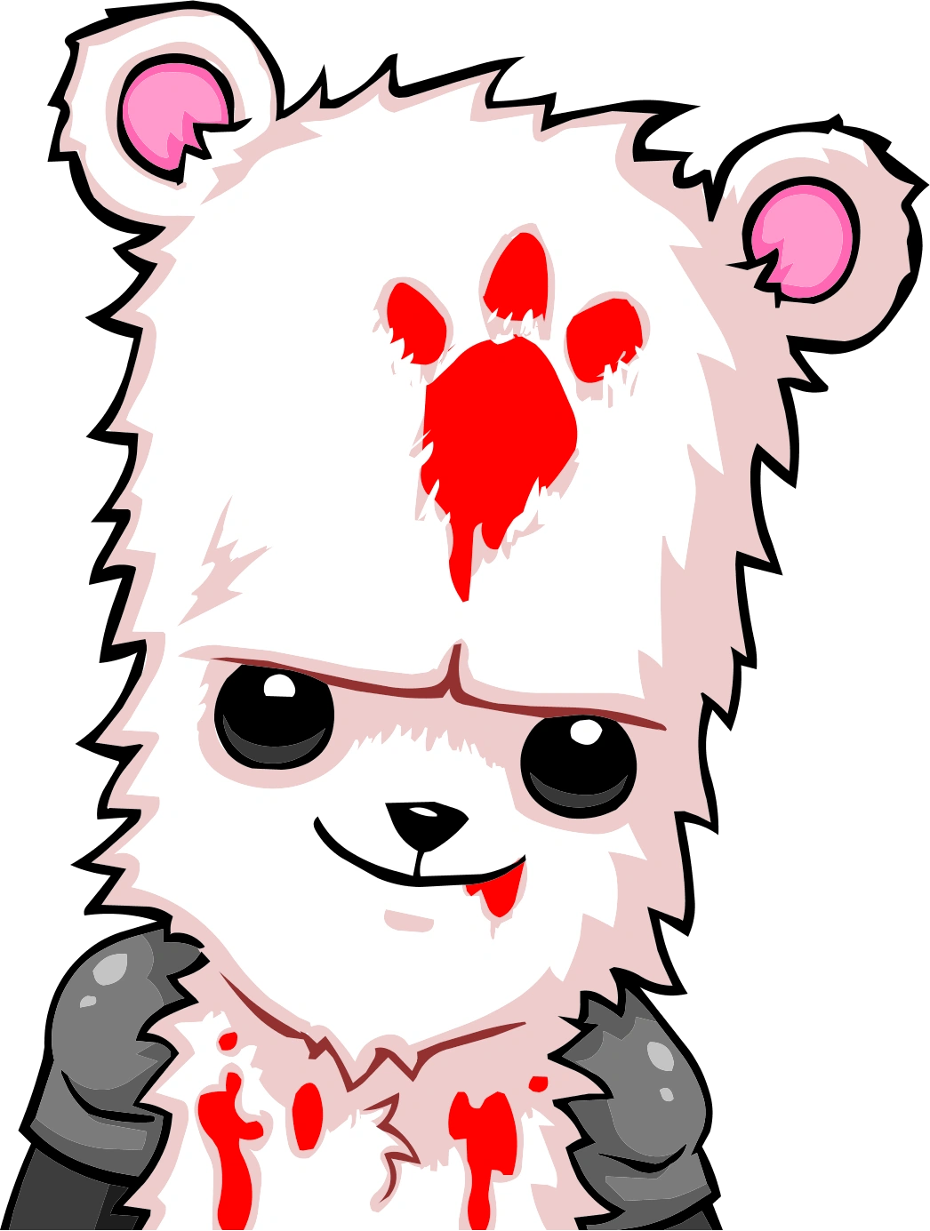 A bloodied, white bear with a mark on its forehead in the shape of a three toed paw, a red tail, and ostensibly appears to not have anything on besides limb armor. The bear has beady, black eyes, a black nose, and round ears that are pink on the inside.